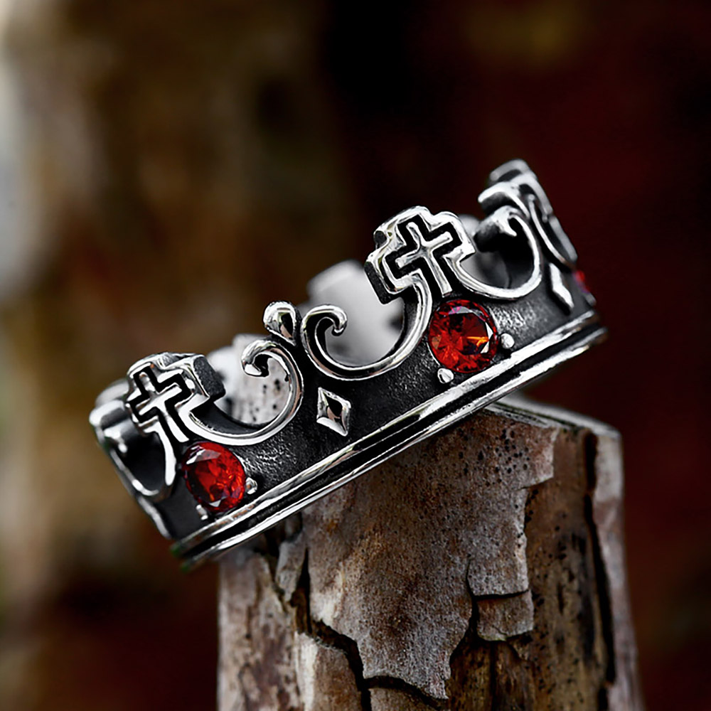 Anillo vintage creativo de acero inoxidable 316L con corona cruzada y piedras rojas para hombre y mujer, joyería cristiana sencilla para fiestas y moda.